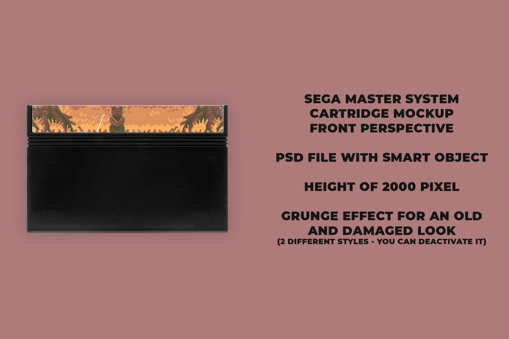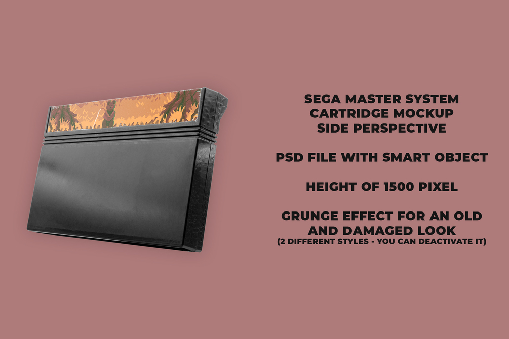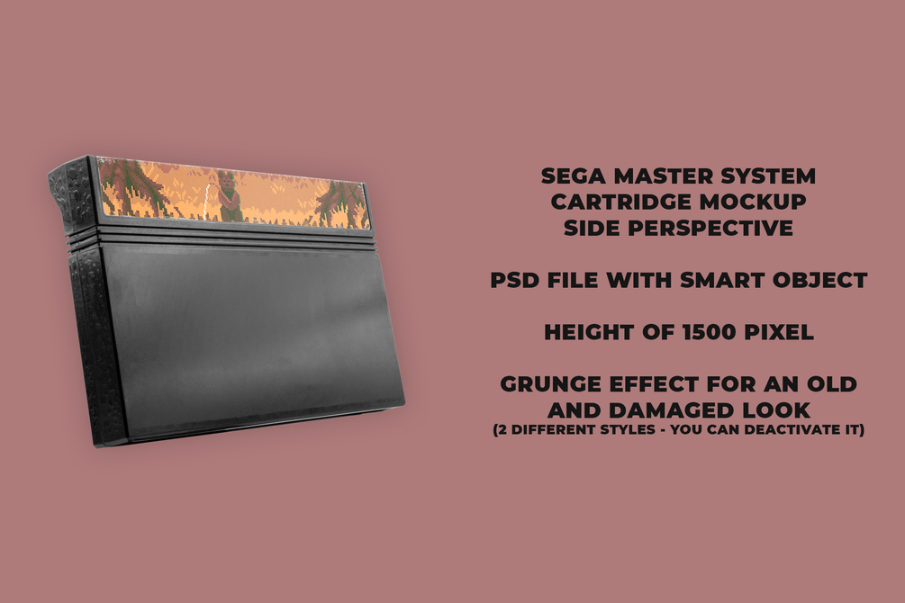 Master System Cartridge mockup for Photoshop with editable smart object in 3 different perspectives. In addition, a grunge effect has been added that makes your graphic look old and damaged (see pictures). The Photoshop files have a minimum height of 1500 pixels.