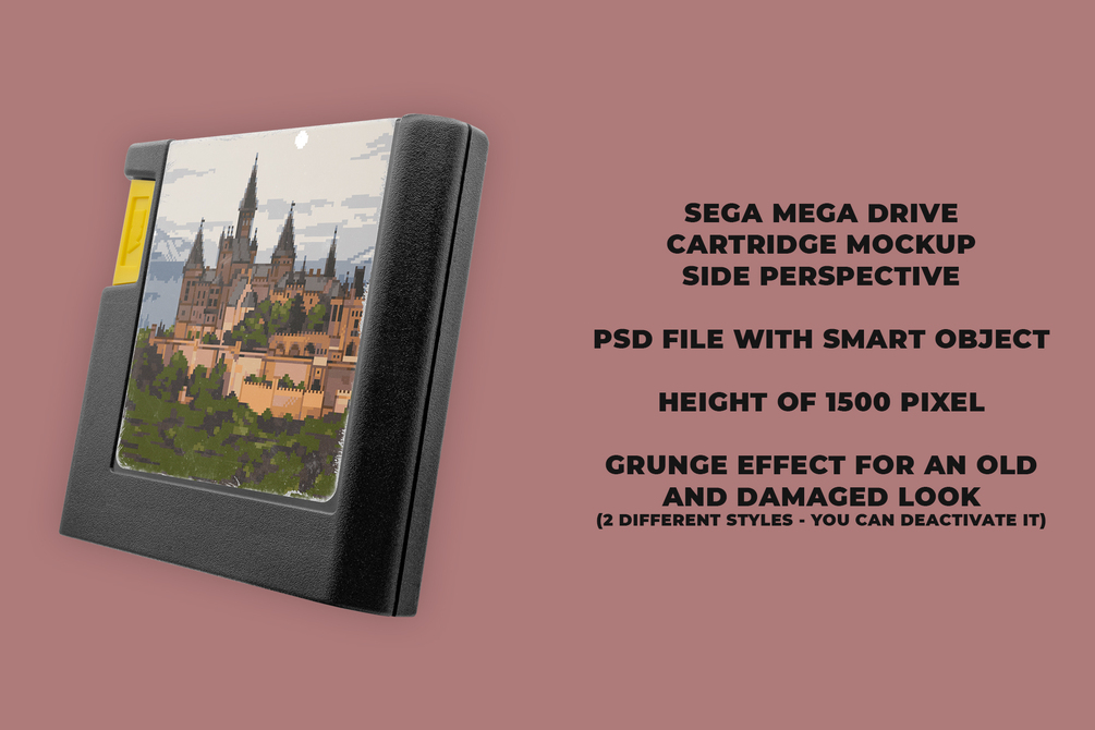 Mega Drive Cartridge mockup for Photoshop with editable smart object in 3 different perspectives. In addition, a grunge effect has been added that makes your graphic look old and damaged (see pictures).